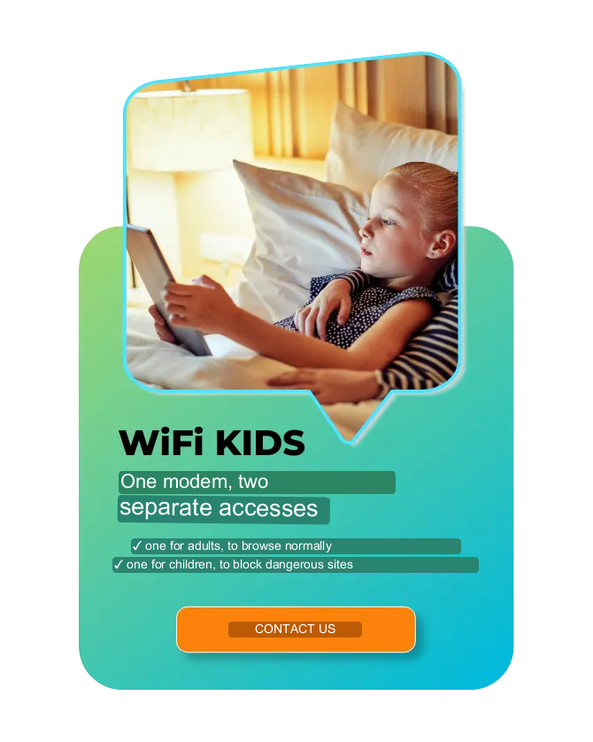 With a single modem and two separate accesses, the WiFi Kids offer offers you the possibility of creating a dedicated connection for the little ones, guaranteeing a safe and controlled online environment. Thanks to this innovative solution, you will be sure that your children will be safe from dangerous sites and inappropriate content.